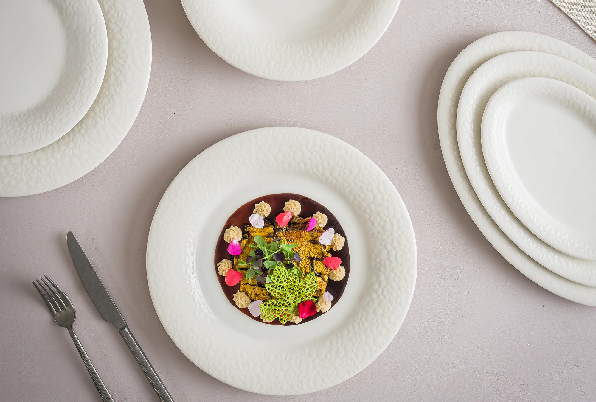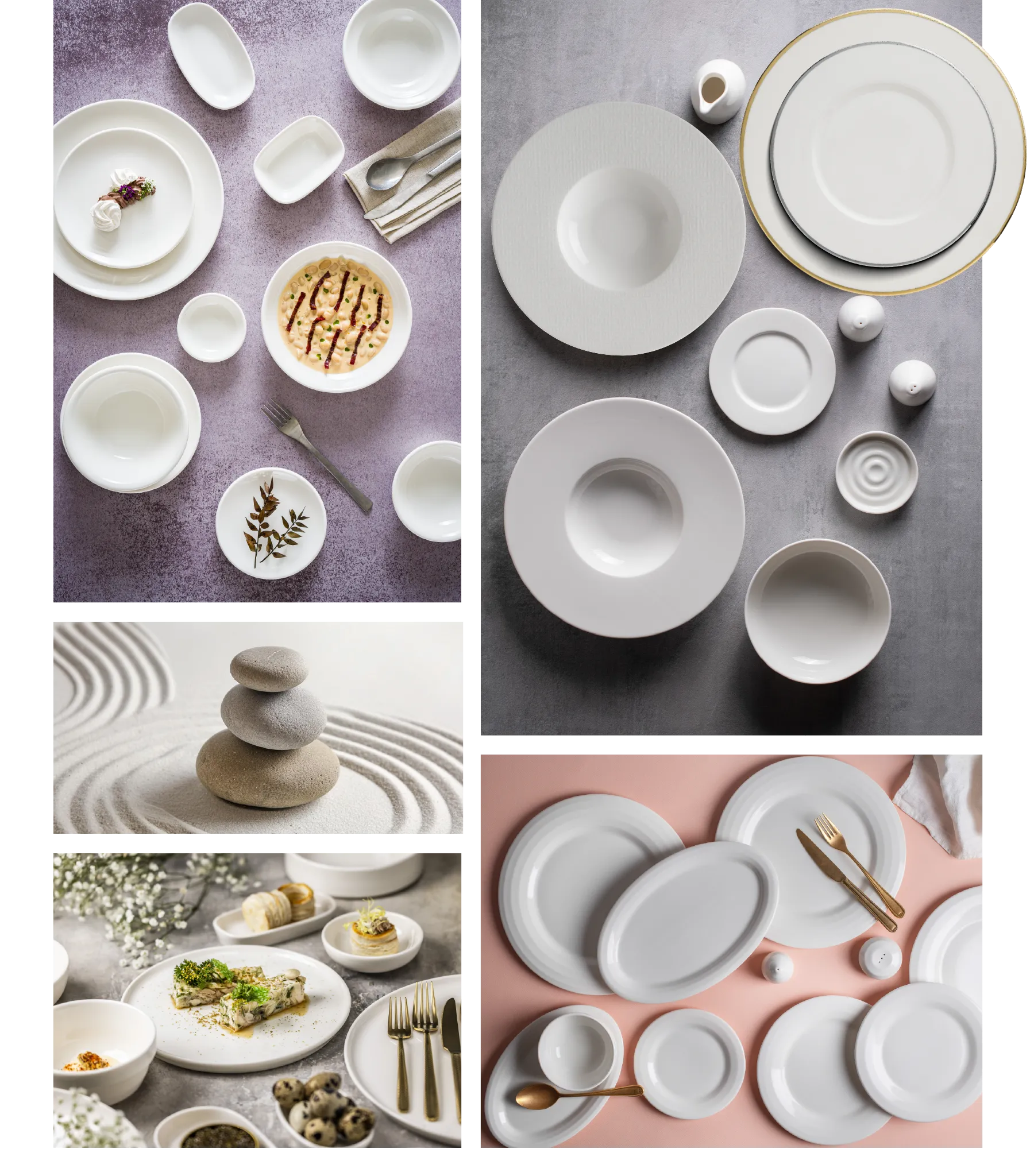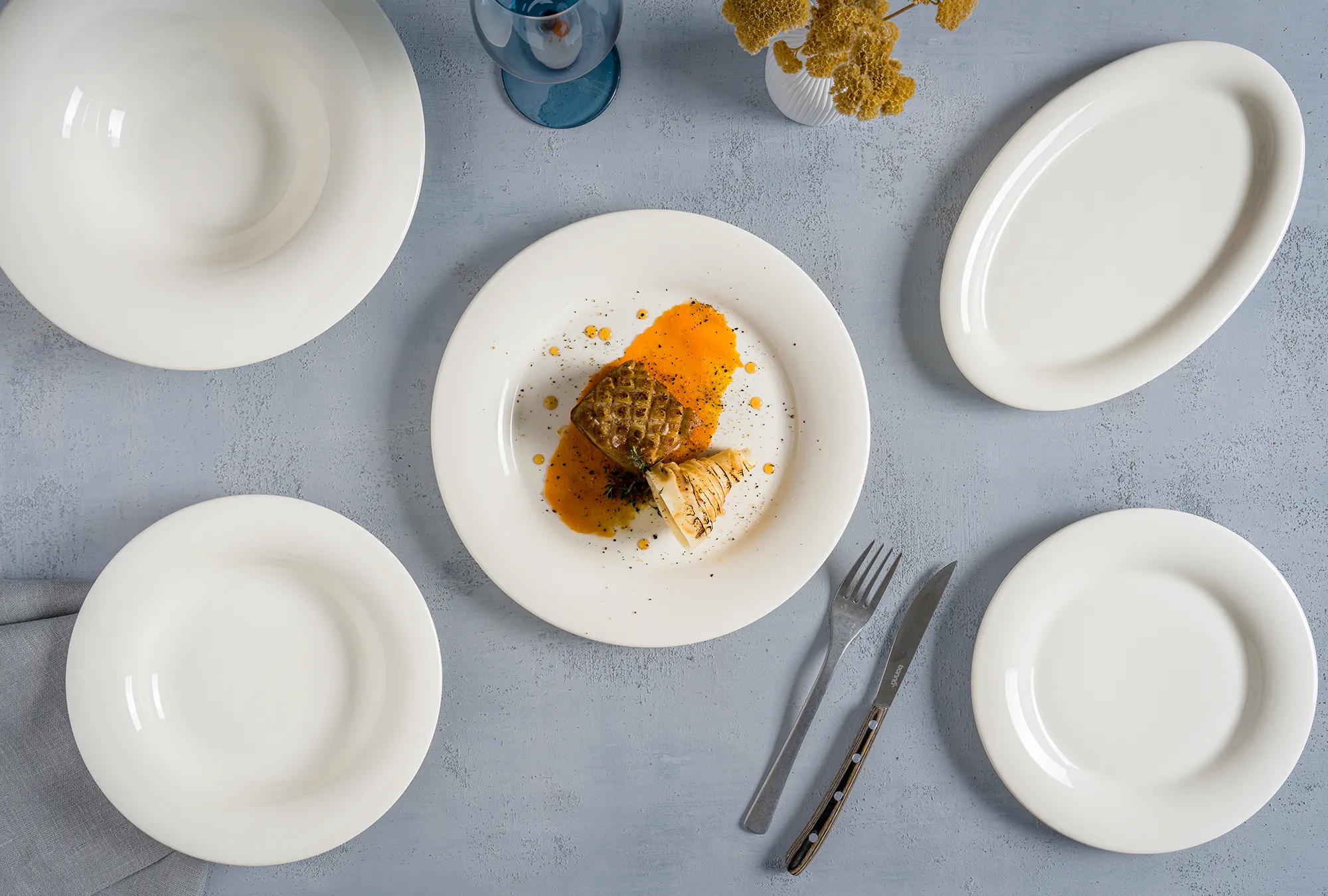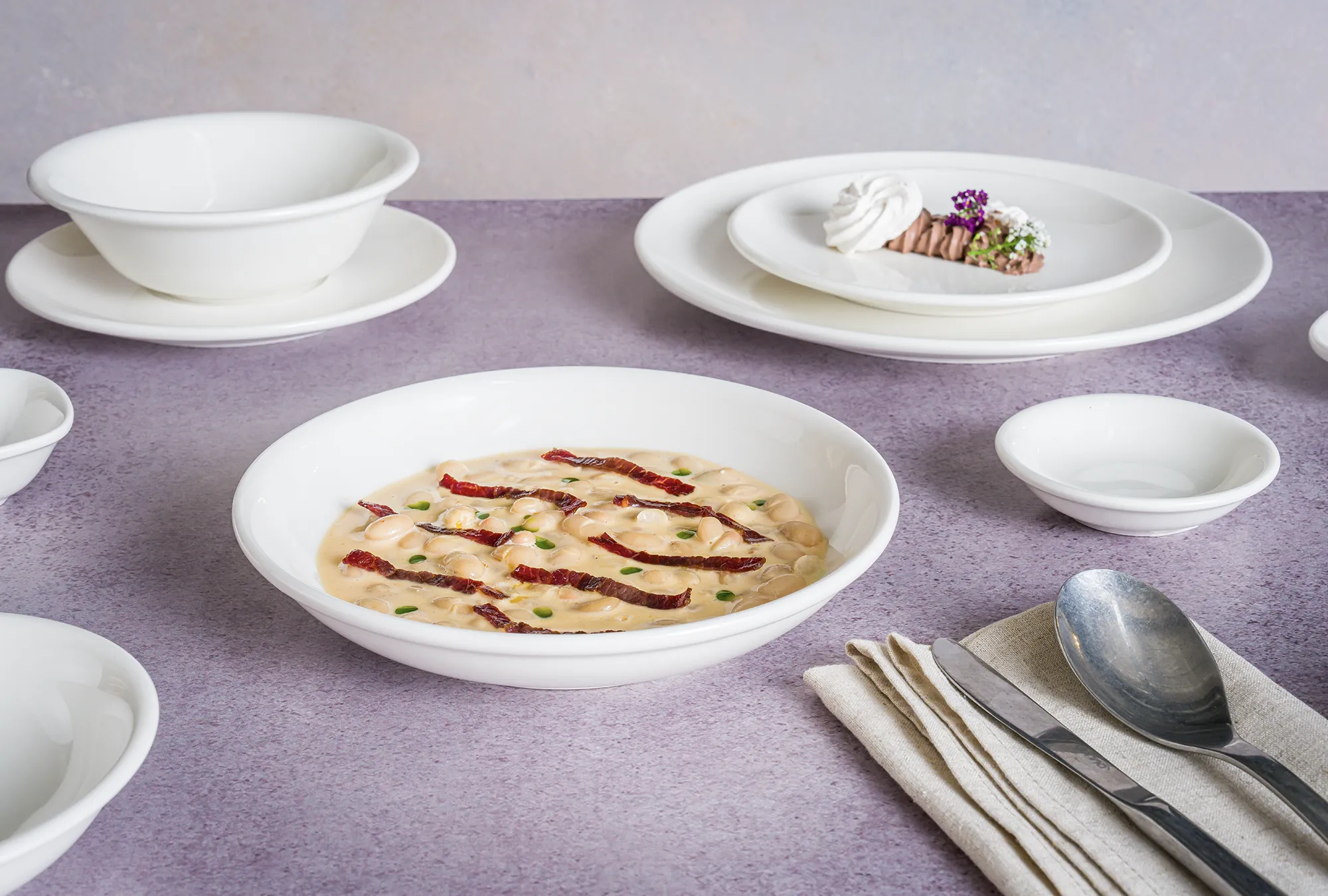 Essential White, beyaz ve kırık beyaz tonlarında zarif porselen tabaklarını bir araya getirerek yemeklerin ön plana çıkmasını sağlıyor.