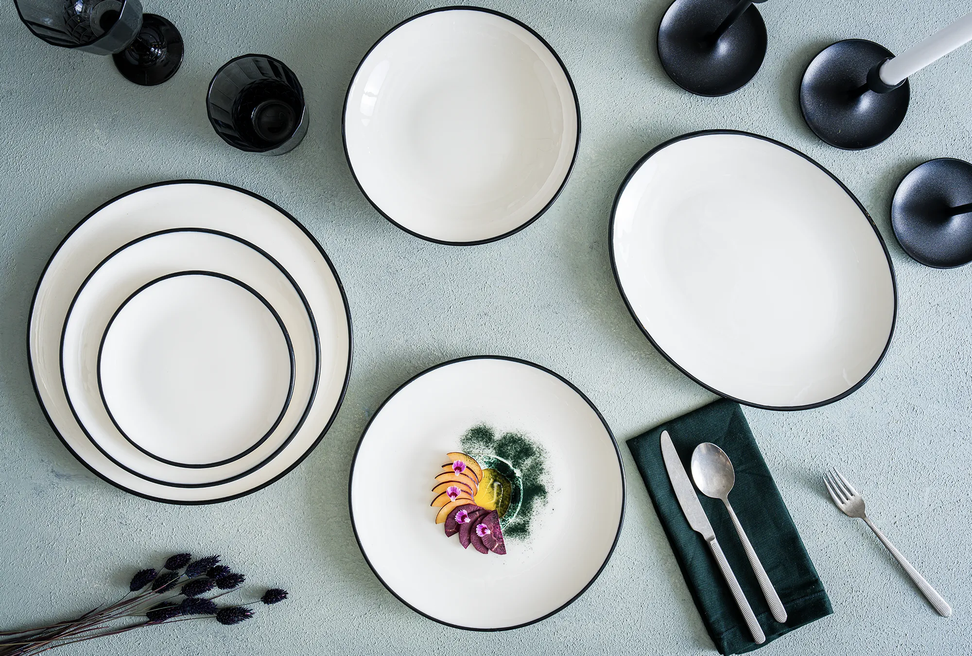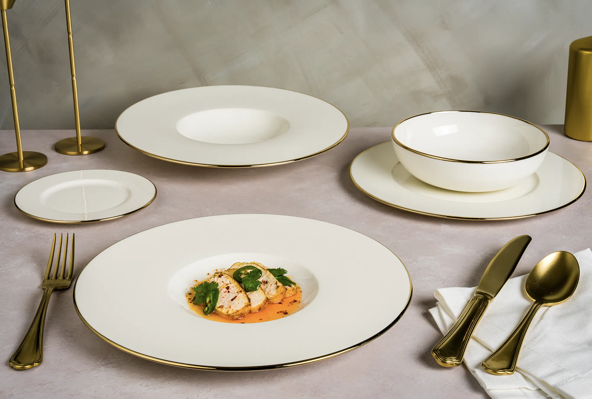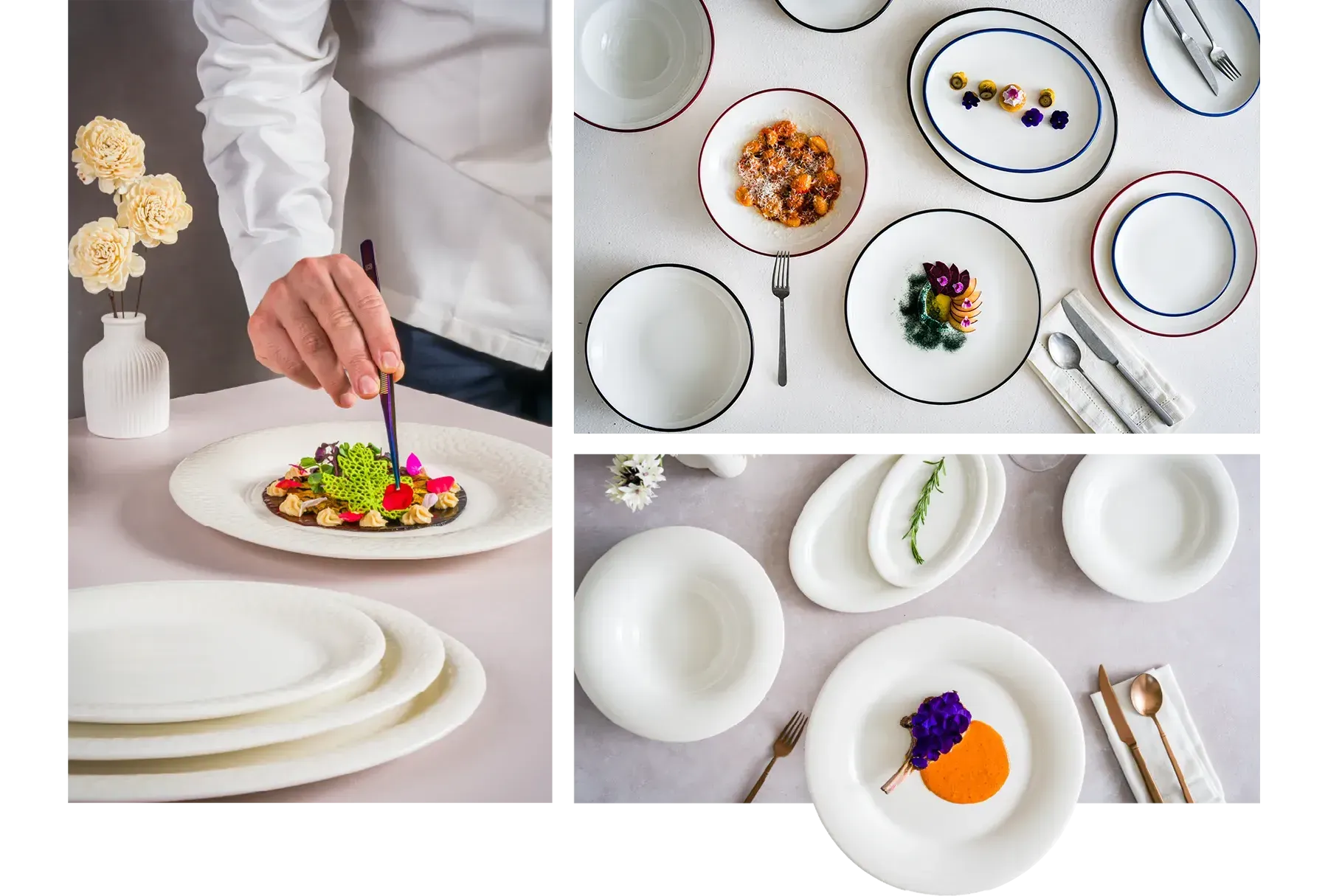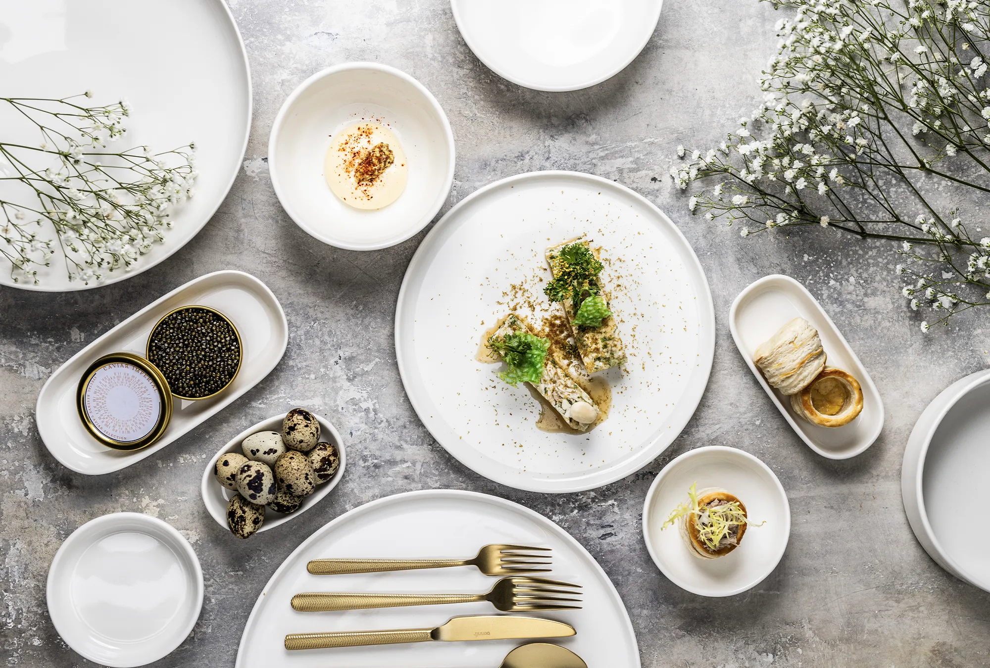 Essential White, beyaz ve kırık beyaz tonlarında zarif porselen tabaklarını bir araya getirerek yemeklerin ön plana çıkmasını sağlıyor.