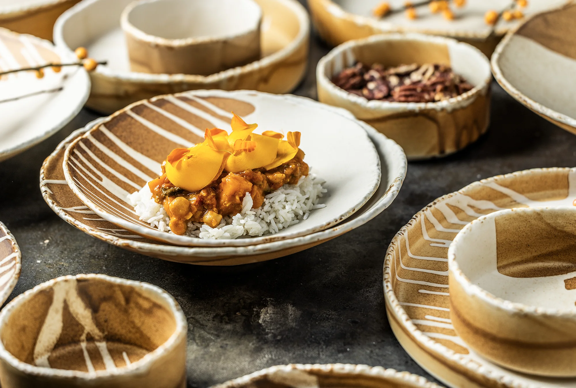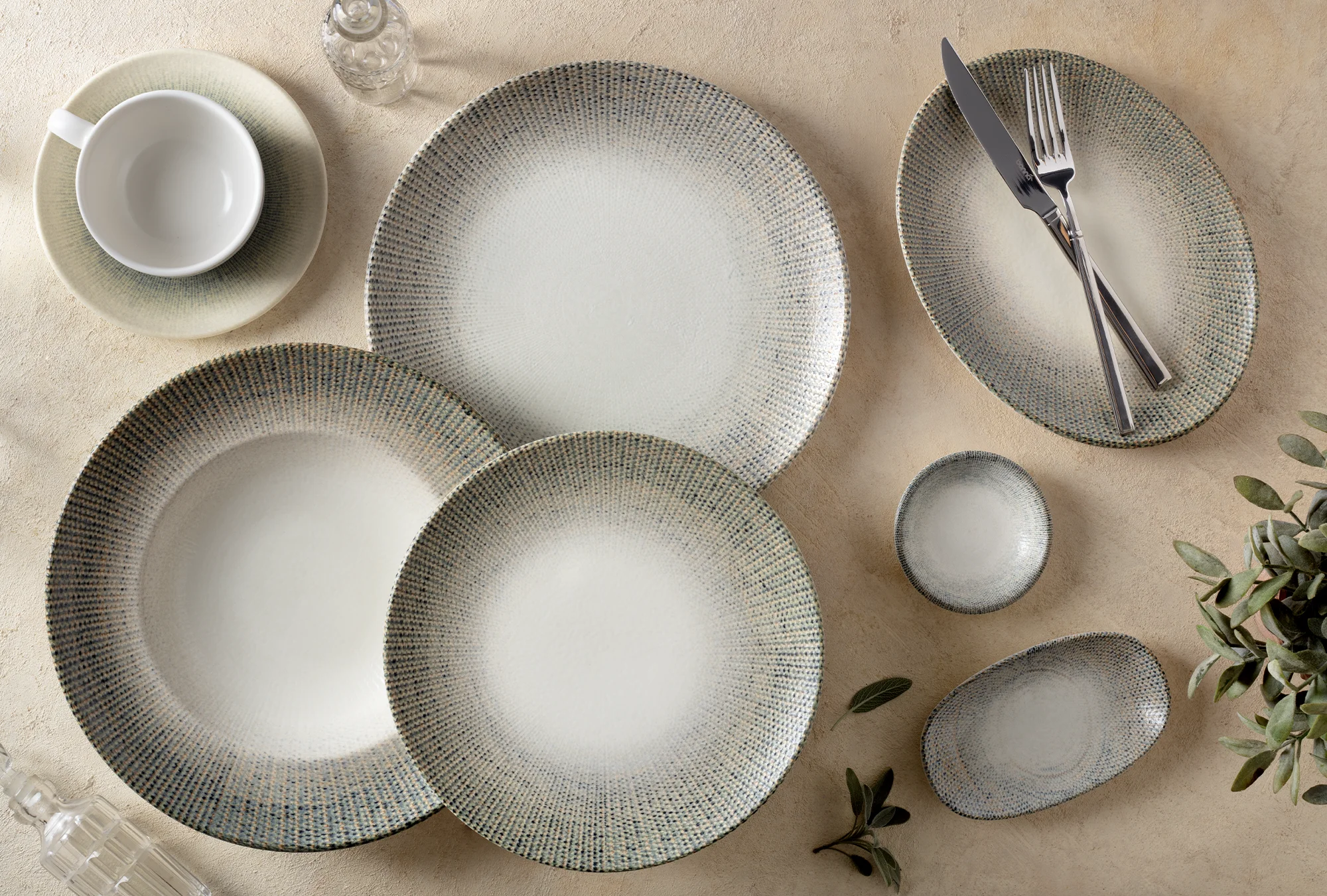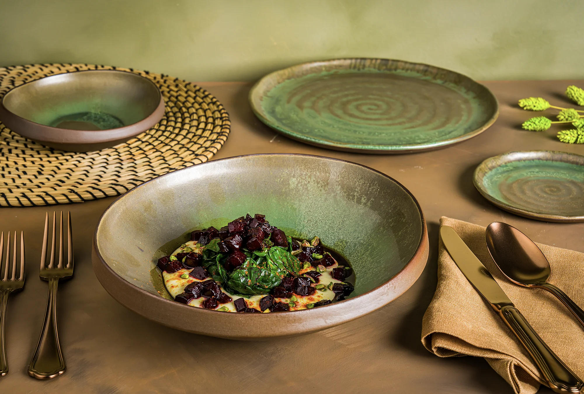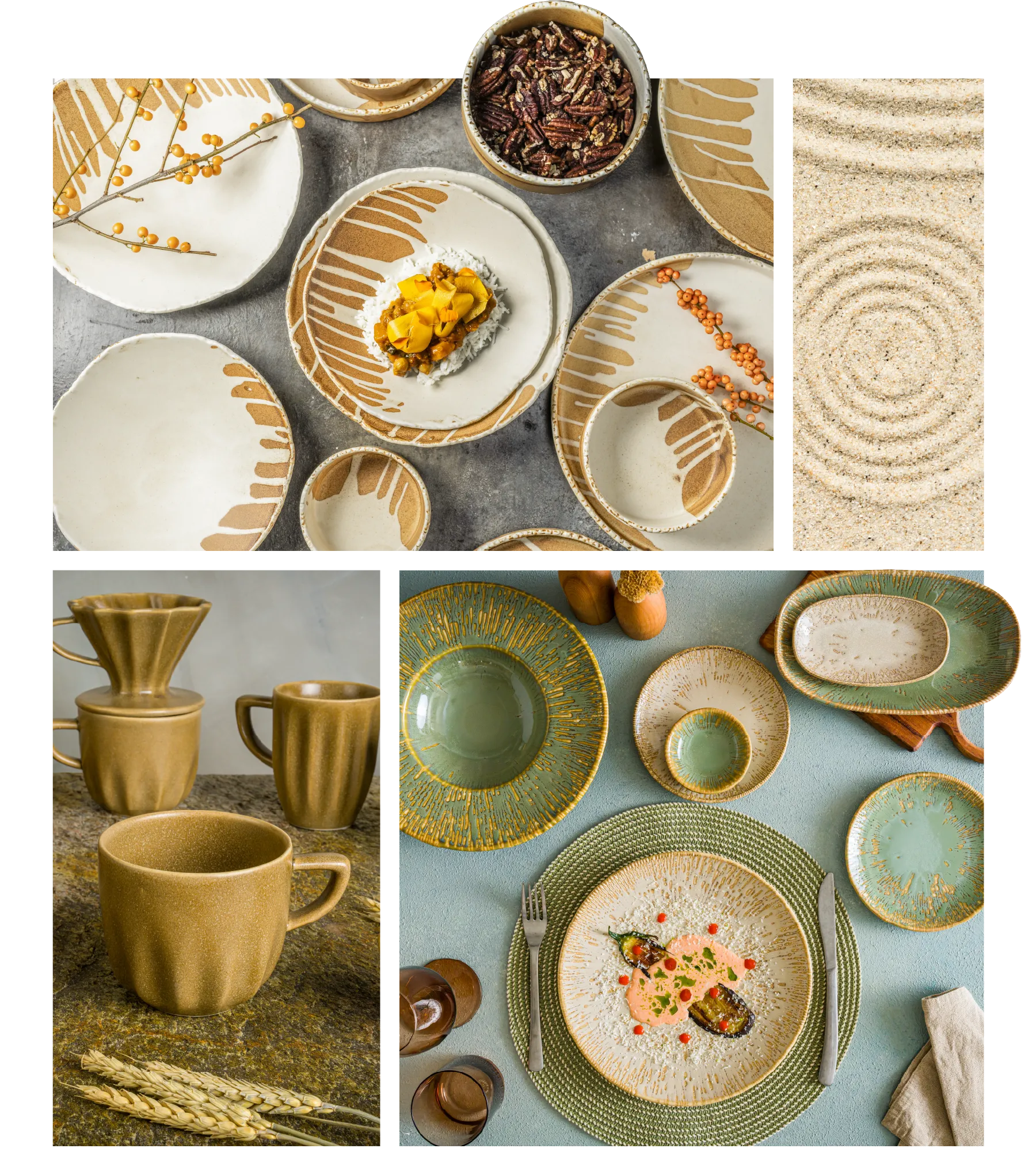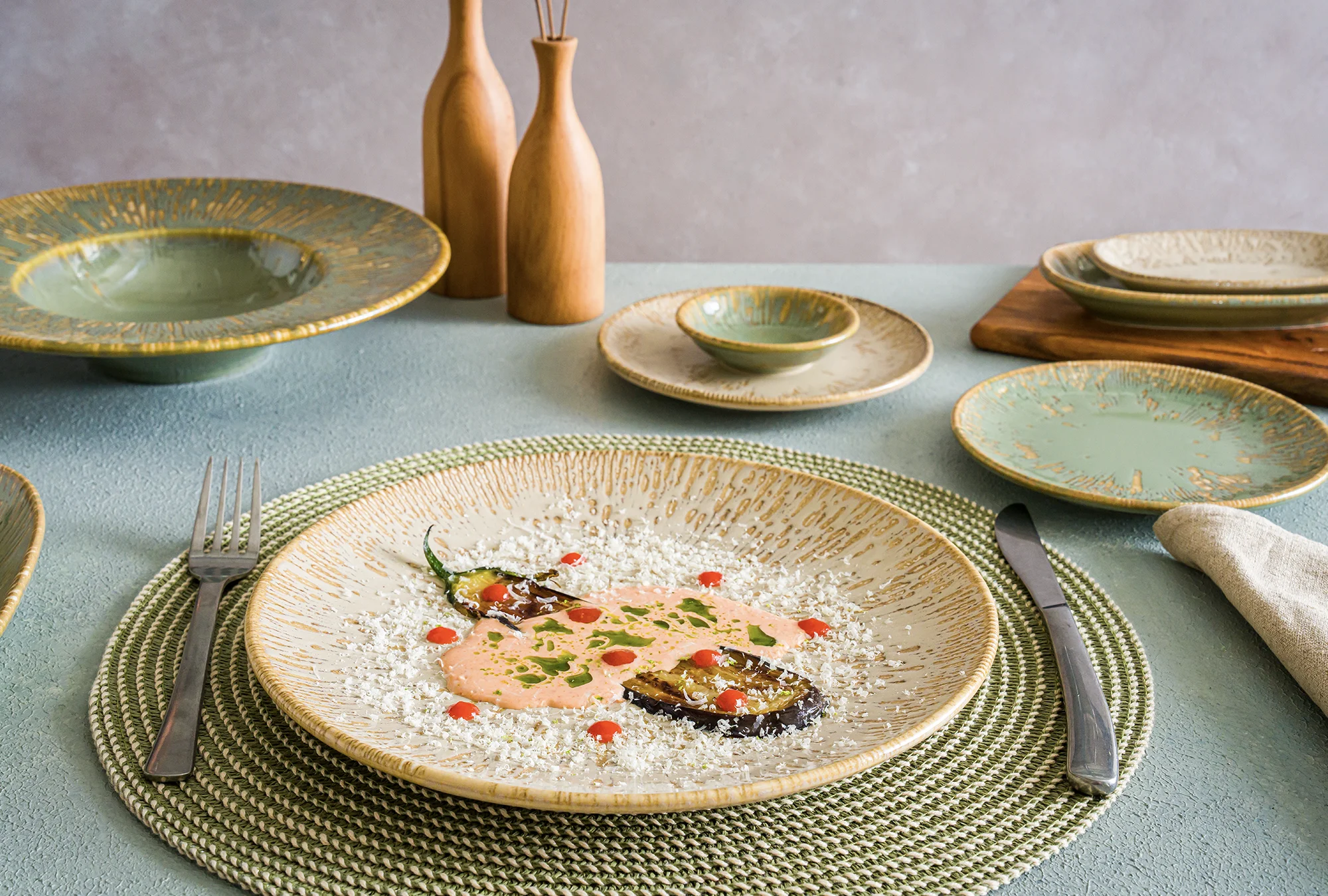 Nature’s Imprint, doğadaki renklerden ve dokulardan ilham alarak, toprak tonları ve yeşil renk skalasıyla tasarlanmış porselen tabakları bir araya getiriyor.